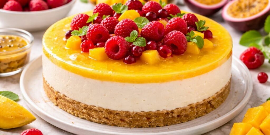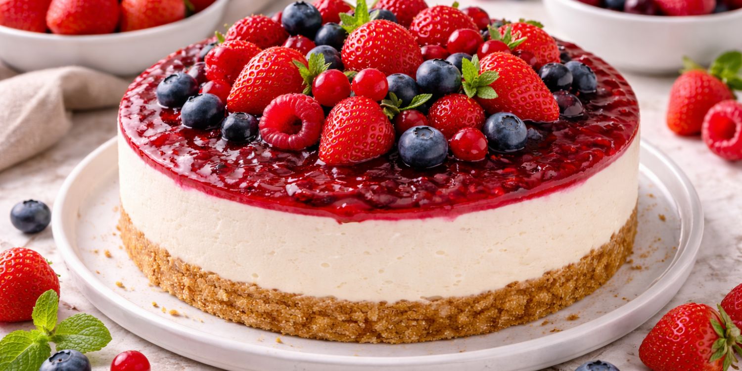 La base peut être réalisée avec des biscuits écrasés et du beurre fondu. La garniture associe fromage frais, sucre et fruits rouges mixés. Un peu de gélatine permet de stabiliser l’ensemble. Le mélange est ensuite versé sur la base. Le passage au frais assure une bonne tenue.