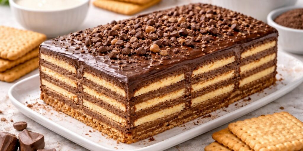 La base repose sur des biscuits trempés dans du lait ou du café. On alterne ensuite les couches avec une crème au beurre ou une ganache au chocolat. Ce jeu de superposition donne un résultat visuellement très appétissant. Après quelques heures au réfrigérateur, les biscuits deviennent tendres. Le gâteau se découpe alors facilement.