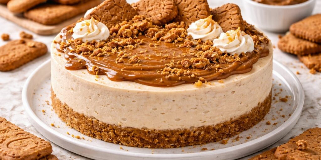 La base est composée de spéculoos écrasés mélangés à du beurre fondu. Cette couche croustillante contraste parfaitement avec la crème onctueuse. La garniture associe fromage frais, sucre et pâte de spéculoos. Le mélange est lisse et très parfumé. Le passage au réfrigérateur permet d’obtenir une belle tenue.