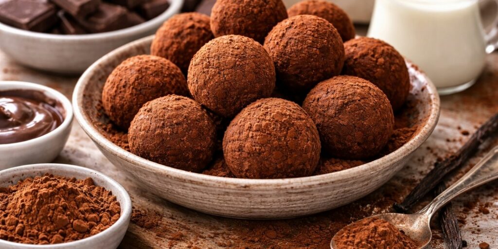 Une fois la préparation ferme, formez des petites boules à la main. Roulez-les dans le cacao en poudre. Conservez-les au frais jusqu’au moment de servir. Succès garanti auprès des invités.