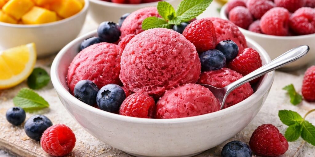 Les fruits doivent être préalablement coupés et congelés. Le sucre permet d’équilibrer l’acidité selon le fruit choisi. Le jus de citron apporte une touche de fraîcheur supplémentaire. Cette recette fonctionne avec des fraises, mangues ou framboises.