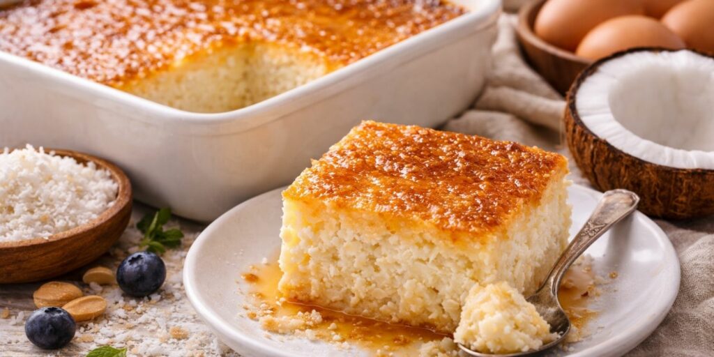 Le lait concentré sucré apporte la douceur et la texture crémeuse. Les œufs permettent au flan de bien se tenir. La noix de coco râpée donne toute la saveur exotique à la recette. L’ensemble forme un mélange parfaitement équilibré.