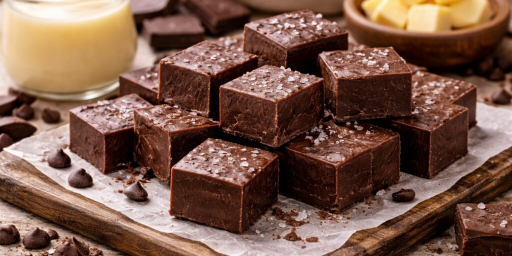Le chocolat noir constitue la base du fudge. Le lait concentré sucré apporte douceur et onctuosité. Le beurre ajoute du fondant à la préparation. Cette combinaison garantit un résultat riche en saveur.