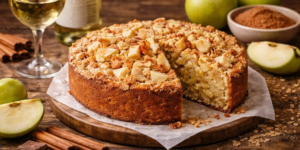 La texture est souvent très tendre grâce à l’humidité des pommes et au liquide apporté par le vin. Le résultat est un gâteau simple mais très parfumé.