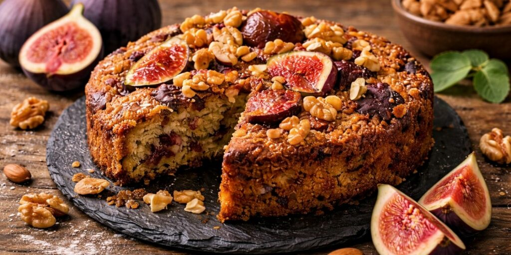 Les noix apportent une saveur intense qui s’accorde très bien avec la douceur des figues. Cette combinaison donne un gâteau rustique et très gourmand. Les sections suivantes détaillent la recette, les ingrédients et la préparation.